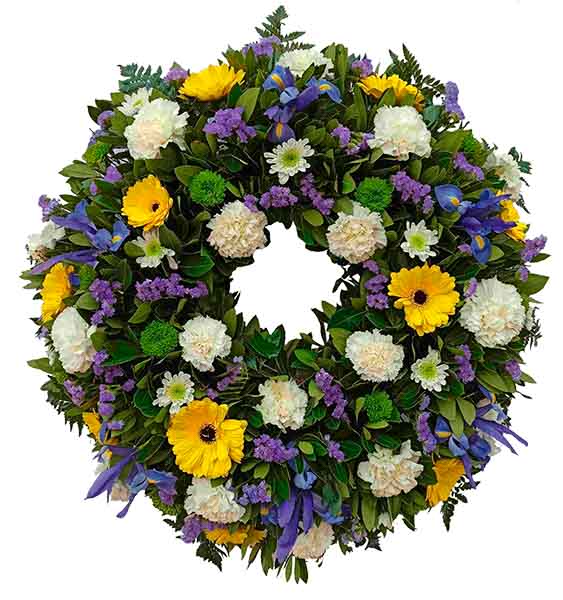 La corona de flores para difuntos con la exclusiva y rara flor IRIS es un arreglo floral fúnebre distinto y especial para mostrar tus condolencias a un precio económico.